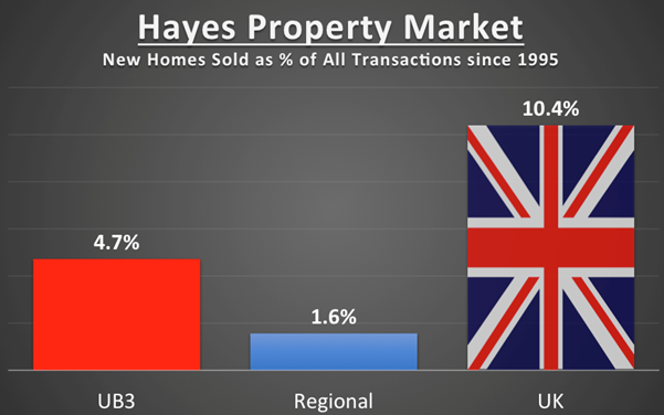 The UK currently has 27.2m households, of which 2.45m (9%) of those have been built since 1995, whereas in Hayes, of the 19,500 households in UB3, 1,030 were built since 1995 (representing 5.3% of all households), meaning Hayes has a lower proportion of new homes building in the last couple of decades than the national figures.