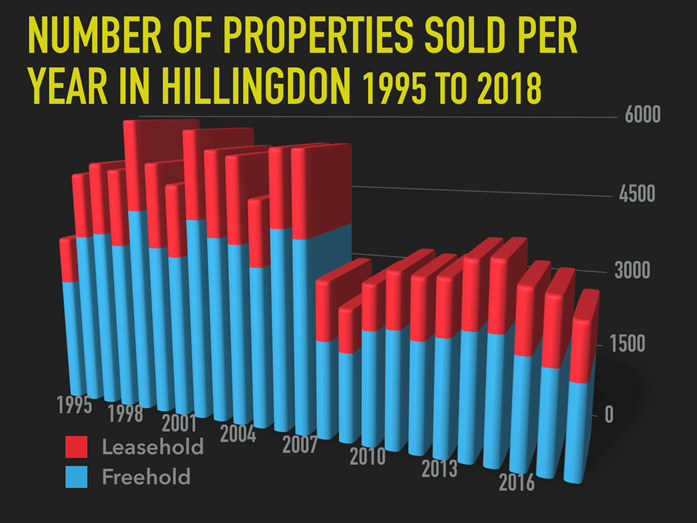 In the late 1990’s, 4,860 properties were sold annually in the Hayes and Hillingdon area, then in the same area, the Millennium boom saw transactions rise to 5,217 per annum. Property sales then dropped by more than a third to 3,032 per annum in the challenge of the global financial crash and subsequent retrenchment of the mortgage market. Post credit crunch (2012 and beyond) locally, on average, 3,337 properties have sold annually.