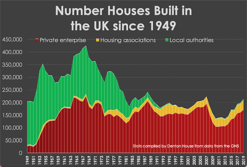 To give you an idea of how this a drop in the ocean, the Government sponsored the independent Barker Review of Housing Supply Report in 2004 which was tasked at looking at what could be done to level the playing field regarding the housing needs for the UK. The report found that the UK needed 240,000 homes to be built each year just to meet the demand of a growing and aging population. Since 2000, the average number of properties built in the UK each year has only been 177,975 per year. This means we have been around 62,000 homes short per year. Therefore, after 20 years of this annual shortfall we, as a country, have 1,240,500 too few homes – hence the massive uplift in house prices over the last two decades.